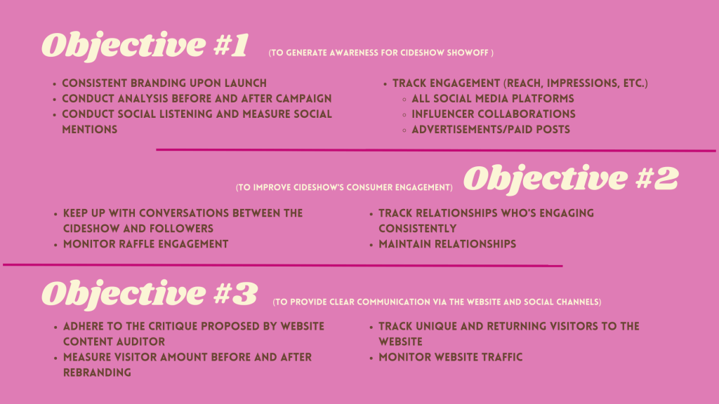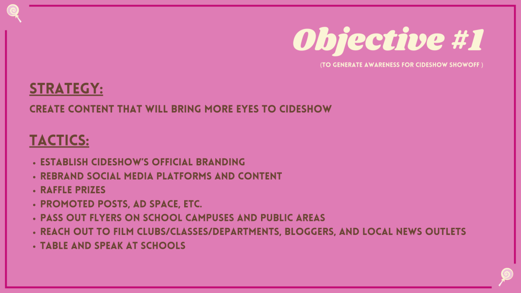 My final project for my senior public relations class was to create a campaign for our client, Cideshow and their annual event, the Cideshow Showoff.