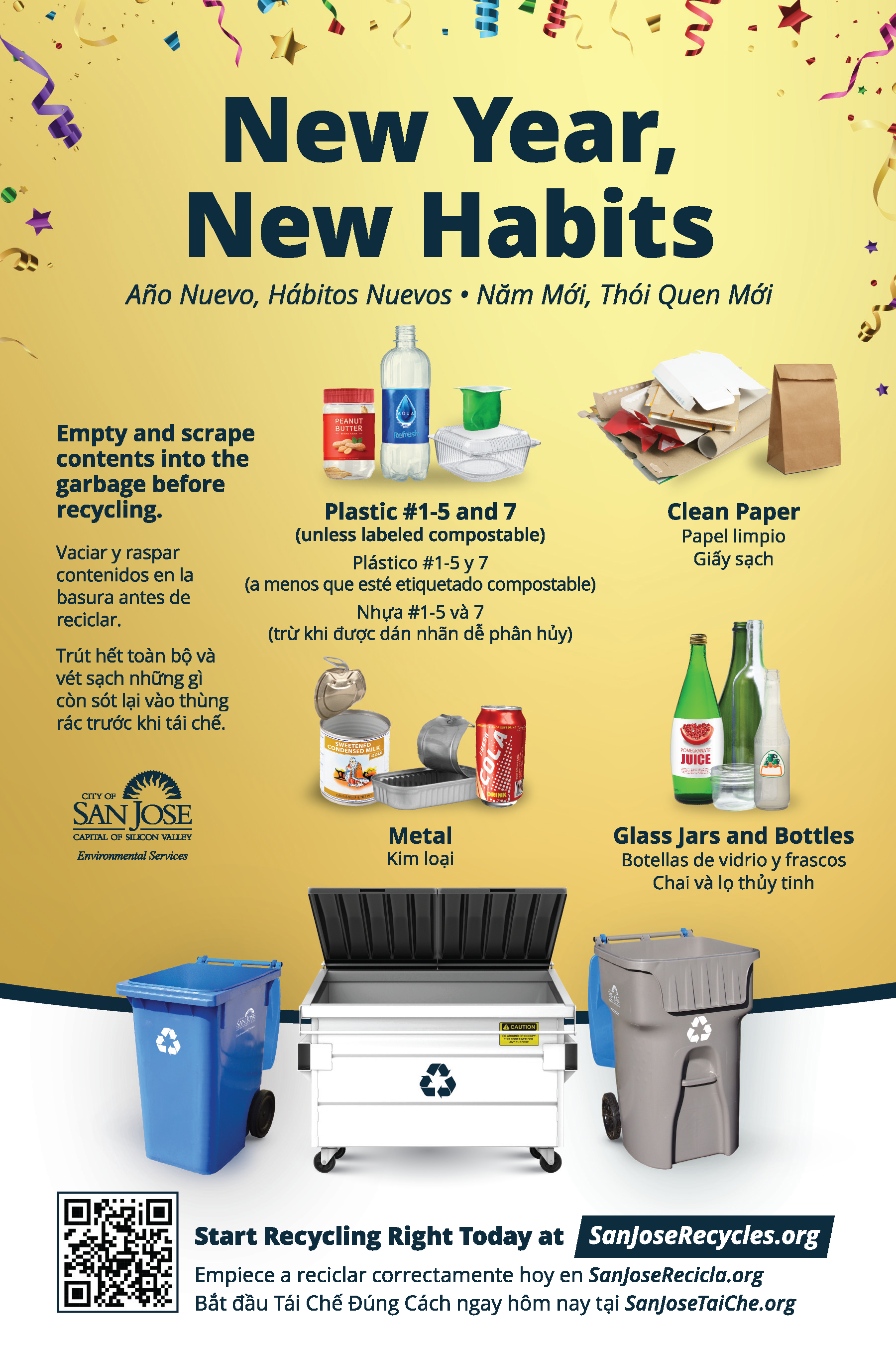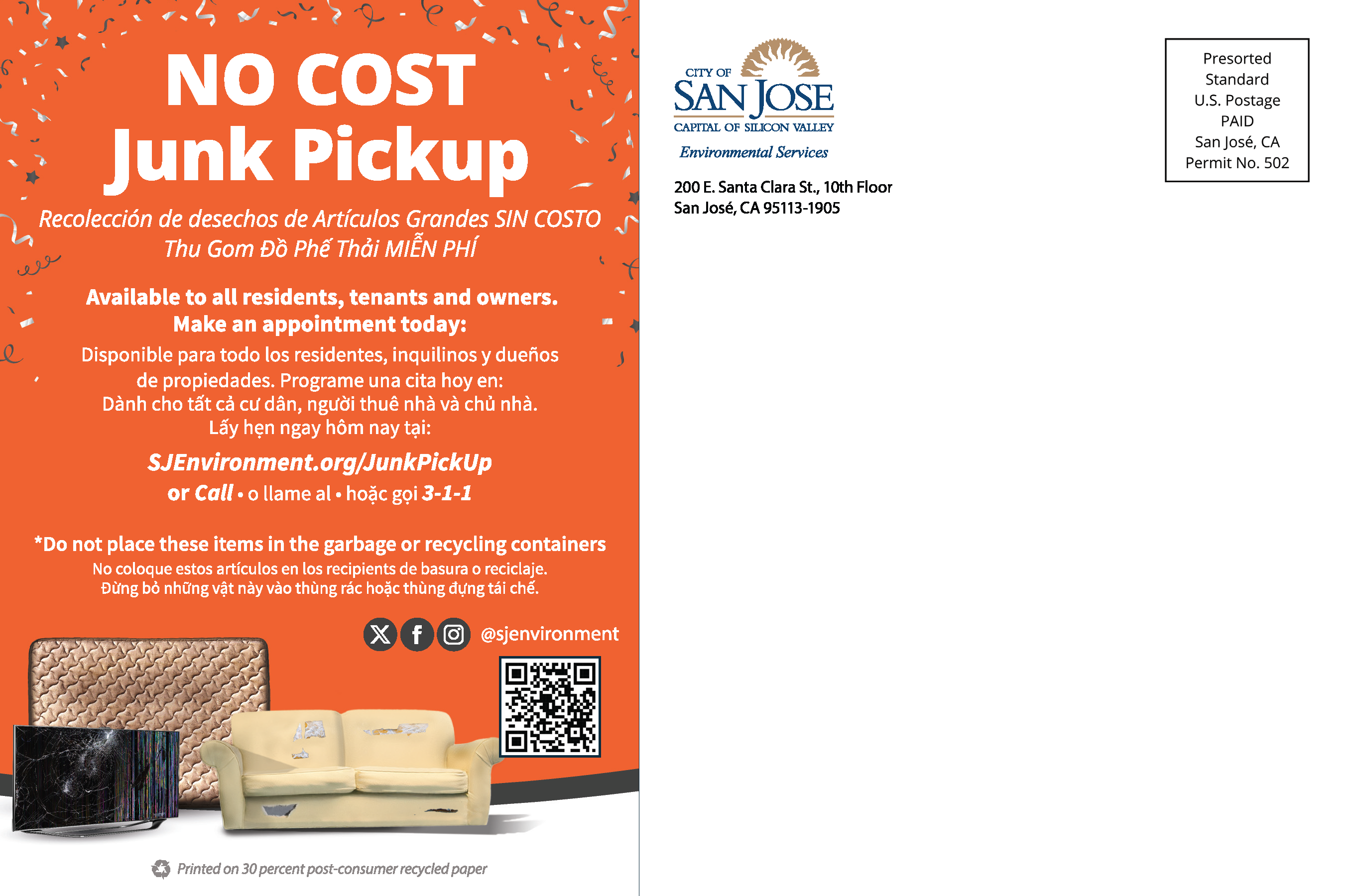 We’ve observed that residents exhibit more participation in behavior change in the new year. In order to capitalize on the new year’s resolution momentum, we send this postcard to all San José residents and include broader call-to-actions for both single-family and multi-family home residents. Some of those include, emptying and scraping into the garbage prior to recycling and highlighting common recyclable items. On the back, we promoted the City’s no-cost junk pickup program, as people tend to clean out their homes for the upcoming year.
