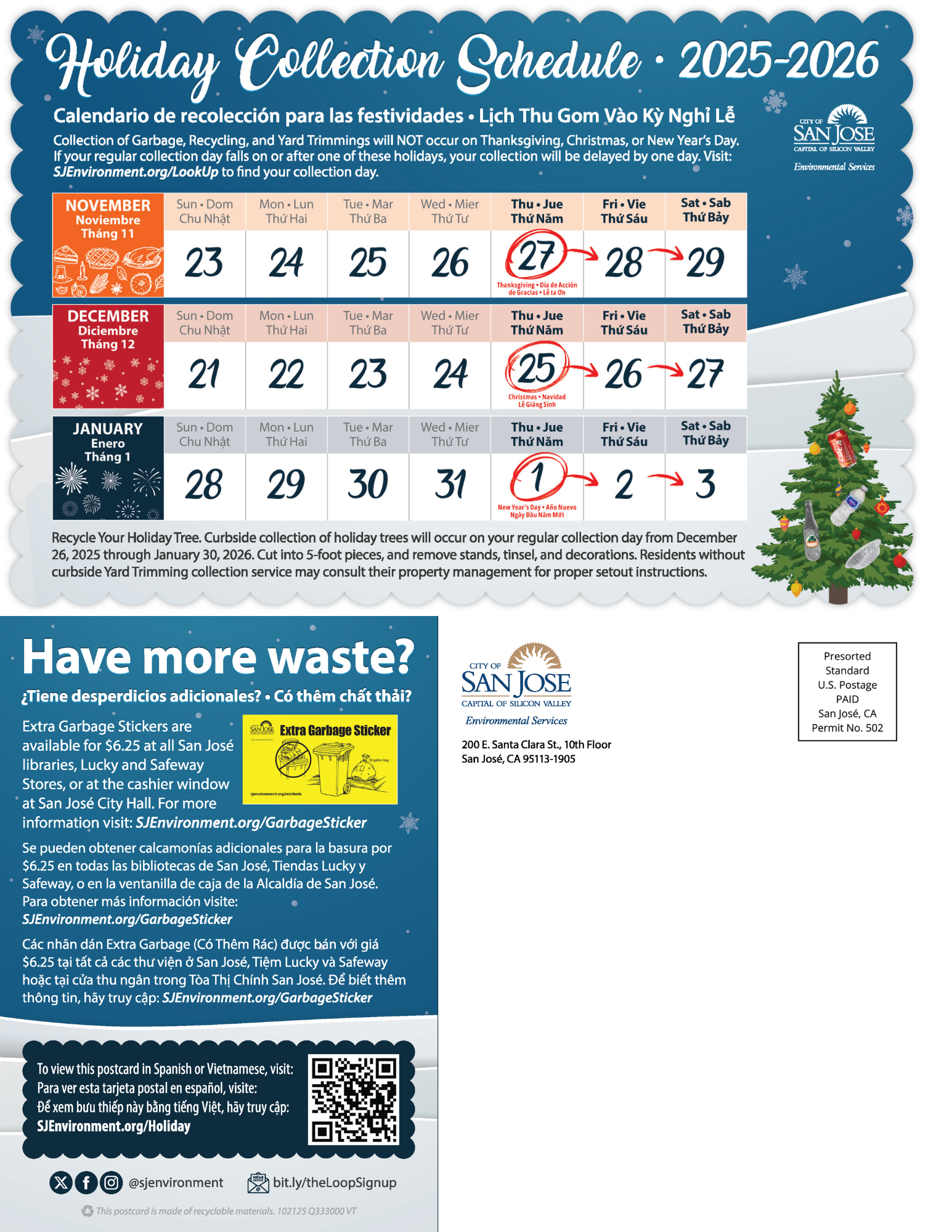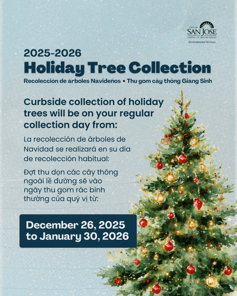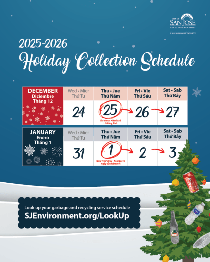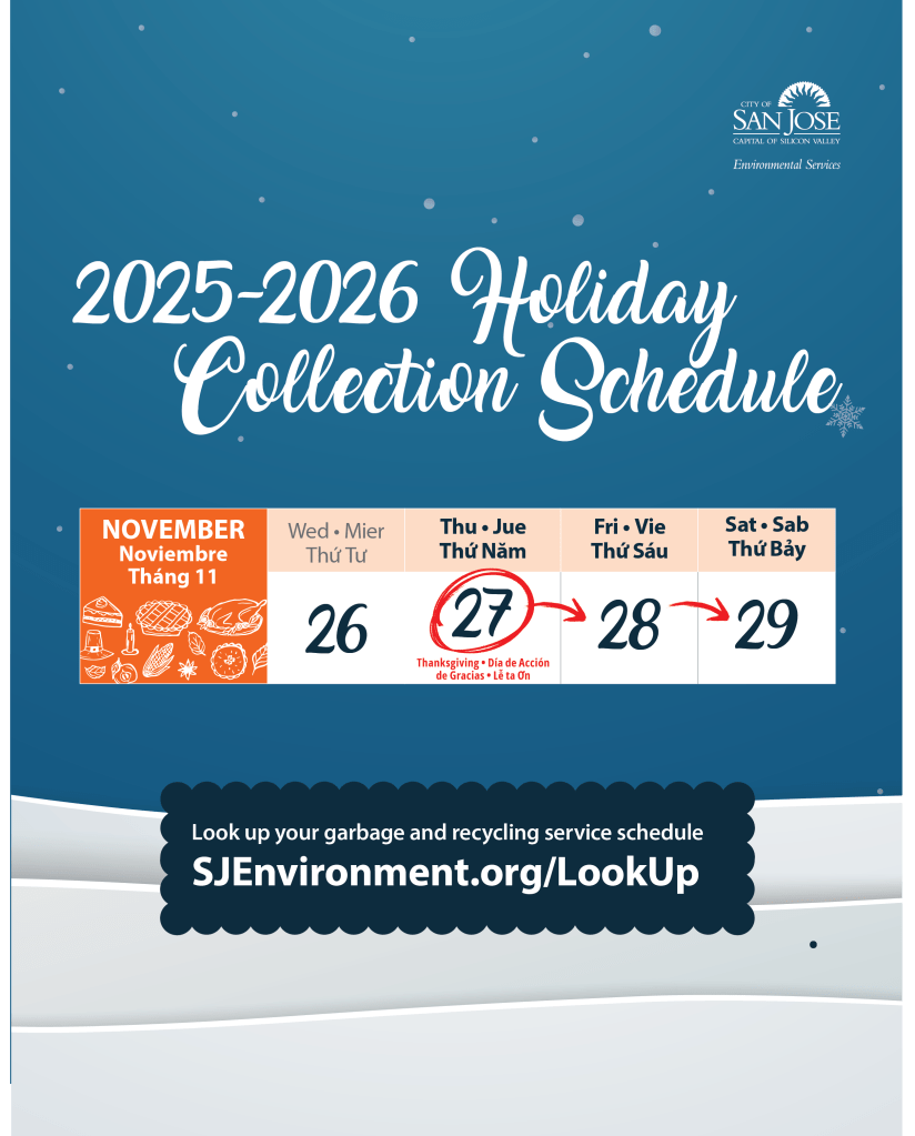 In preparation for the end-of-the-year holidays, the City of San José Environmental Services Department (ESD) informs residents about changes to recycling and garbage collection during the holidays.