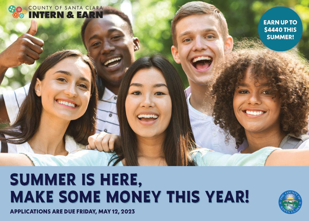 Two variations of a postcard promoting the summer cohort for the County of Santa Clara’s Intern and Earn program.
